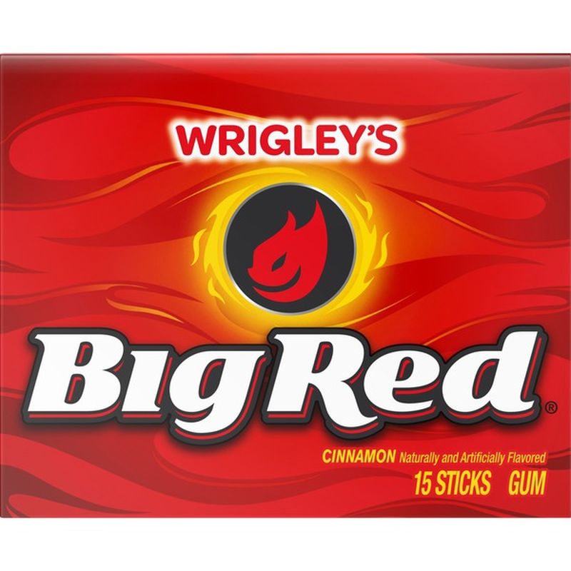 Wrigley's Big Red Gum has been the #1 selling cinnamon gum since 1987. Since 1975 the classic hot cinnamon gum has been fascinating our taste buds and dates. 15 Sticks Per Pack. Sugar, Gum Base, Corn Syrup, Natural And Artificial Flavors; Less Than 2% of: Glycerol, Soy Lecithin, Color Added, Acesulfame K, Hydroxylated Soy Lecithin, Aspartame.